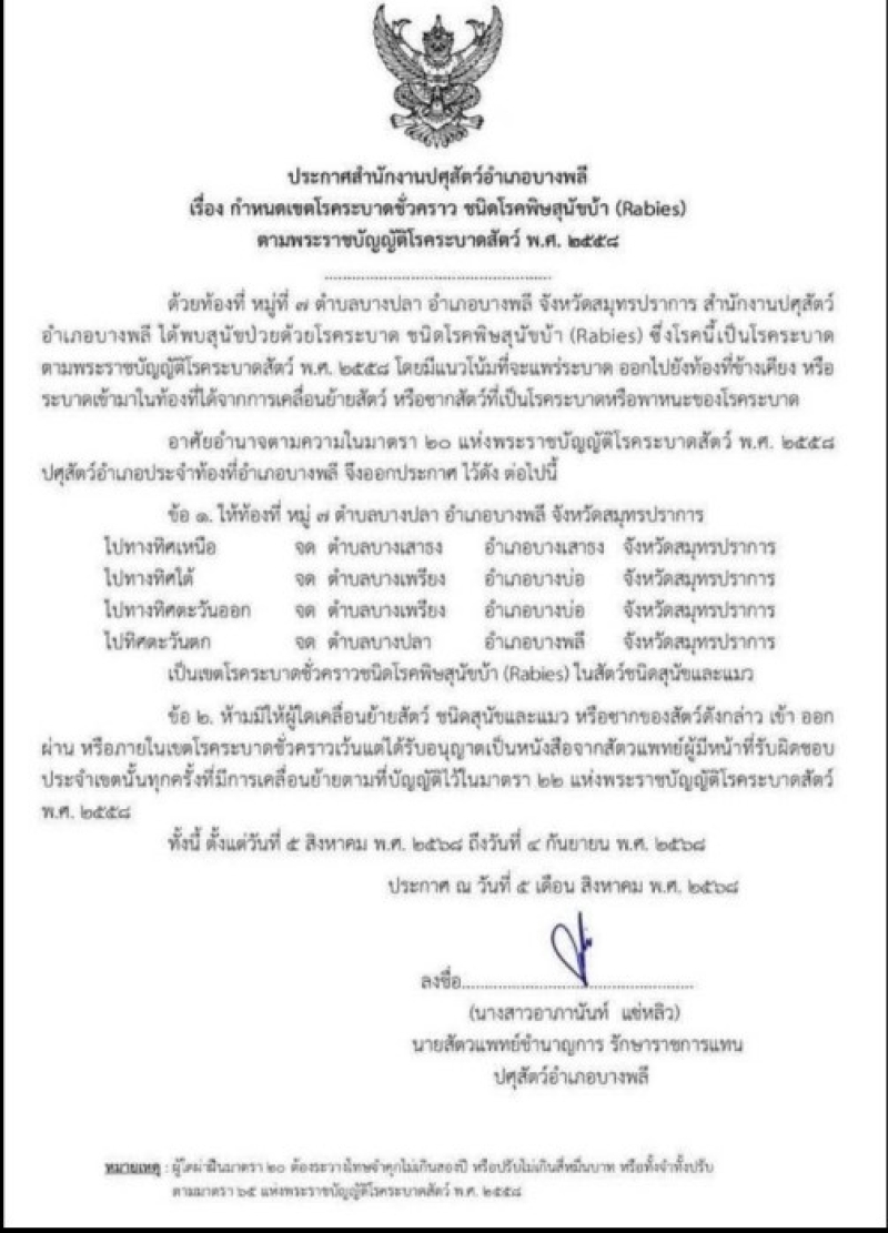 วันที่ 9 สิงหาคม 2568 สํานักงานปศุสัตว์อําเภอบางพลี ออกประกาศเขตโรคระบาดสัตว์ โรคพิษสุนัขบ้า