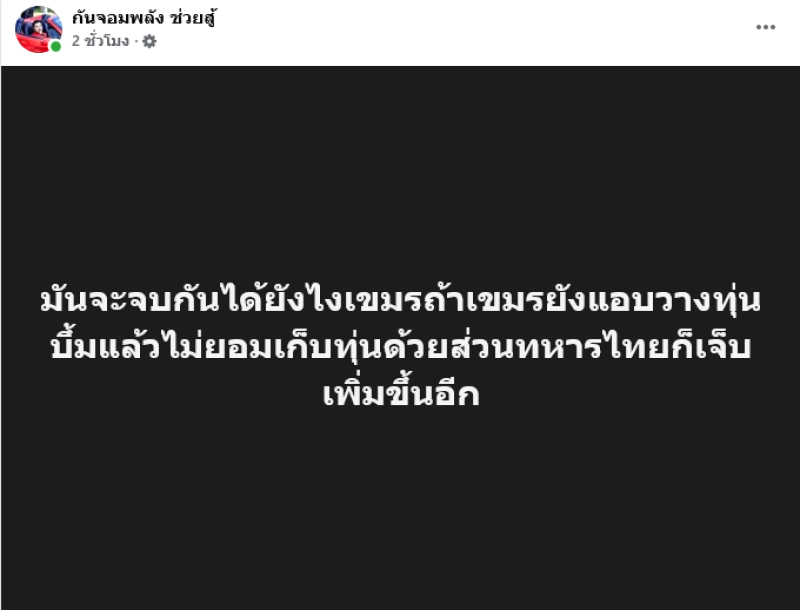 ล่าสุดทางด้าน กัน จอมพลัง รีบเคลื่อนไหวทันที ระบุว่า มันจะจบกันได้ยังไงเขมรถ้าเขมรยังแอบวางทุ่นบึ้มแล้วไม่ยอมเก็บทุ่นด้วยส่วนทหารไทยก็เจ็บเพิ่มขึ้นอีก แล้วฝั่งมันวางคนของเราเจ็บมันก็ไม่เคยสนใจเหลียวแลเรื่องนี้ควรที่จะตอบโต้อะไรมันบ้างนะ