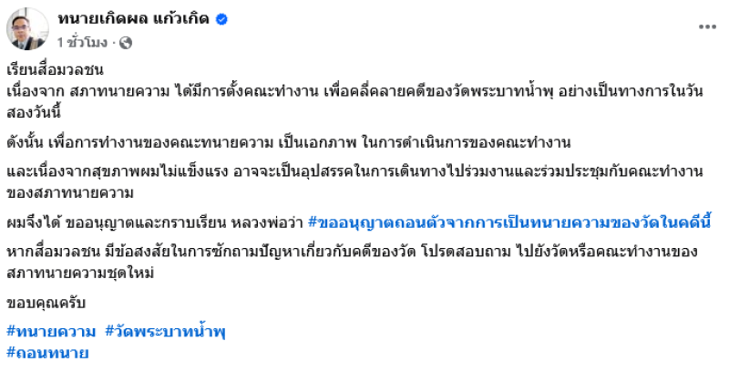 และเนื่องจากสุขภาพผมไม่แข็งแรง อาจจะเป็นอุปสรรคในการเดินทางไปร่วมงาน และร่วมประชุมกับคณะทำงานของสภาทนายความ ผมจึงได้ ขออนุญาตและกราบเรียน หลวงพ่อว่า #ขออนุญาตถอนตัวจากการเป็นทนายความของวัดในคดีนี้ หากสื่อมวลชน มีข้อสงสัยในการซักถามปัญหาเกี่ยวกับคดีของวัด โปรดสอบถาม ไปยังวัดหรือคณะทำงานของสภาทนายความชุดใหม่