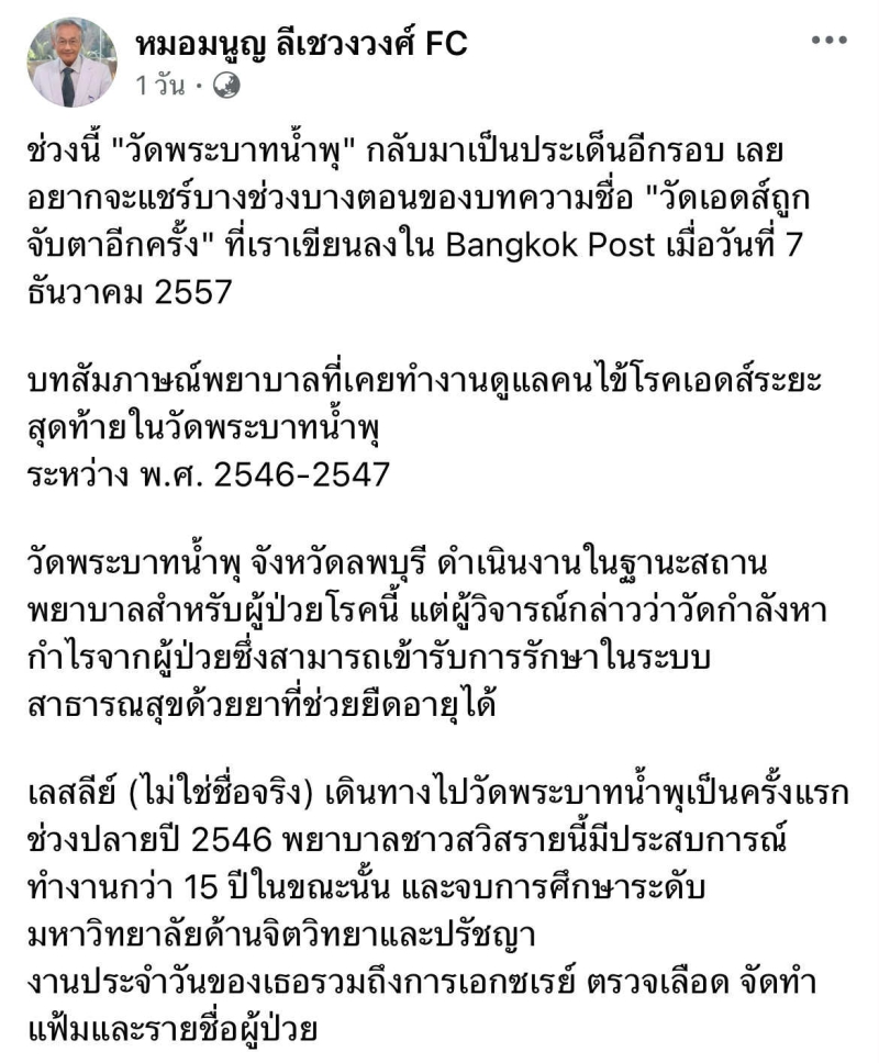 เรียกได้ว่า หลายคนคงรู้จัก กับ แพทย์ผู้เชี่ยวชาญโรคติดเชื้อ อย่าง นพ.มนูญ ลีเชวงวงศ์ ล่าสุด หมอมนูญ ได้ออกมาแชร์บทความข่าวเมื่อปี 2014 ผ่านเฟซบุ๊ก หมอมนูญ ลีเชวงวงศ์ เกี่ยวกับประเด็นโรคเอดส์ พร้อมเขียนข้อความว่า ช่วงนี้ วัดพระบาทน้ำพุ กลับมาเป็นประเด็นอีกรอบ เลยอยากจะแชร์บางช่วงบางตอนของบทความชื่อ วัดเอดส์ถูกจับตาอีกครั้ง ที่ เรา เขียนลงใน Bangkok Post เมื่อวันที่ 7 ธันวาคม 2557