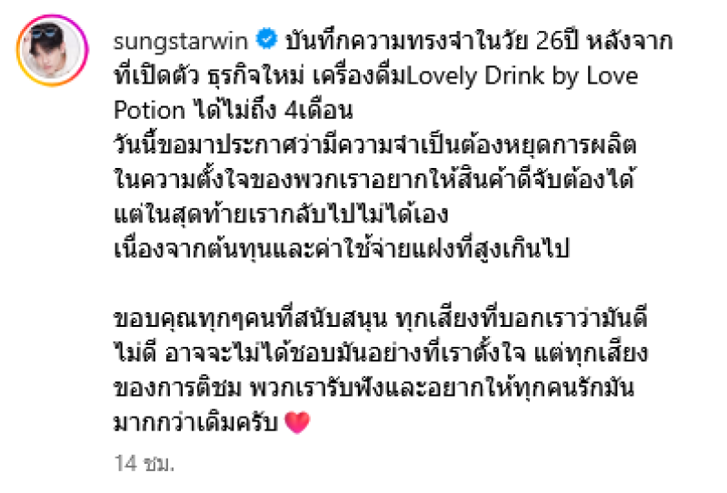 ล่าสุดเมื่อวันที่ 16 ส.ค. 68 ที่ผ่านมา ซุง ศตาวิน ได้ออกมาโพสต์บันทึกความทรงจำผ่านางอินสตาแกรมsungstarwin ระบุว่า บันทึกความทรงจำในวัย 26 ปี หลังจากที่เปิดตัว ธุรกิจใหม่ เครื่องดื่ม Lovely Drink by Love Potion ได้ไม่ถึง 4เดือน