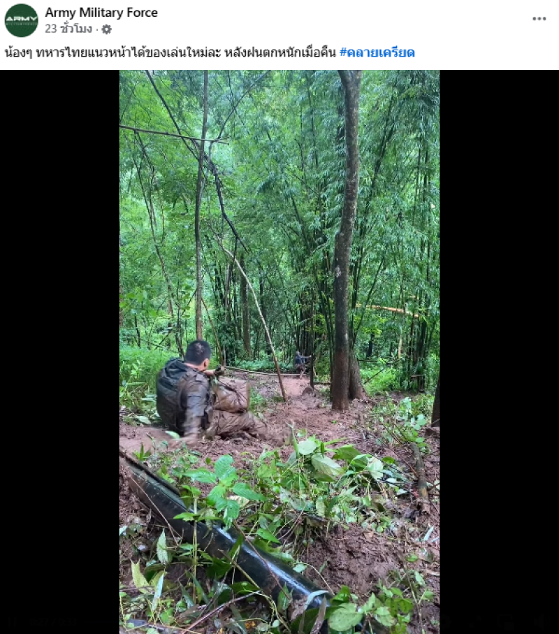 จากเพจ Army Military Force ได้มีการโพสต์คลิปทหารแนวหน้าได้ของเล่นใหม่ หลังฝนตกหนักเมื่อคืน ซึ่งเป็นภาพของทหาร มีการสไลด์ตัวลงทางลาดชันที่เต็มไปด้วยโคลนอย่างสนุกสนาน