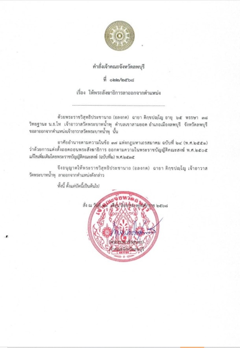 วันที่ 19 ส.ค. 68 ทางเจ้าคณะจังหวัด ได้ออกมาหนังสืออย่างเป็นทางการแล้วว่า เรื่อง ให้พระสังฆาธิการลาออกจากตําาแหน่ง