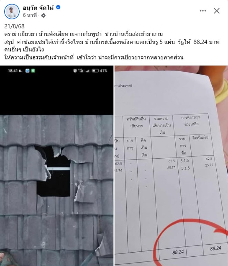 วันที่ 21 ส.ค. 68 ทาง อนุวัต จัดให้ ได้ออกมาโพสต์ว่า ดราม่าเยียวยา บ้านพังเสียหายจากกัมพูชา ชาวบ้านเริ่มส่งเข้ามาถาม สรุป ค่าซ่อมแซมได้เท่านี้จริงไหม บ้านนี้กระเบื้องหลังคาแตกเป็นรู 5 แผ่น รัฐให้ 88.24 บาท คนอื่นๆ เป็นยังไง ให้ความเป็นธรรมกับเจ้าหน้าที่ เข้าใจว่า น่าจะมีการเยียวยาจากหลายภาคส่วน
