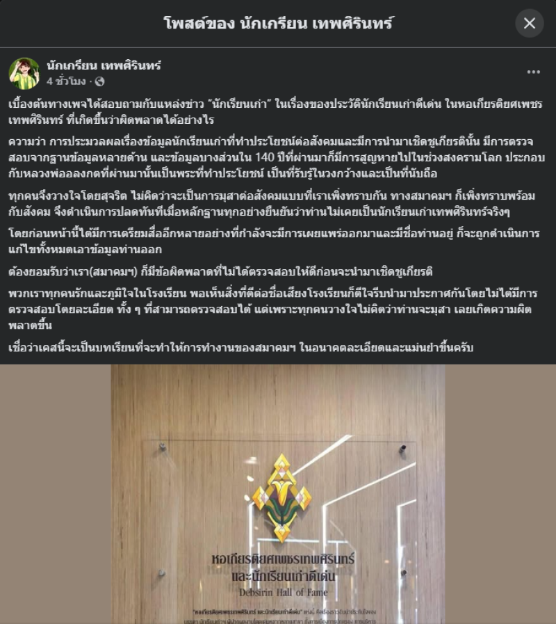 ล่าสุด เพจเฟซบุ๊ก นักเกรียน เทพศิรินทร์ ซึ่งเป็นเพจของกลุ่มศิษย์เก่าโรงเรียนเทพศิรินทร์ ได้โพสต์ข้อความชี้แจงกรณีดังกล่าว โดยระบุว่า หลังจากเกิดกระแสวิพากษ์วิจารณ์ในสังคม ทางสมาคมศิษย์เก่าได้เร่งตรวจสอบข้อมูลจากแหล่งข่าวที่เป็นนักเรียนเก่าอย่างใกล้ชิด เพื่อหาสาเหตุของความคลาดเคลื่อนที่เกิดขึ้นในรายชื่อ “นักเรียนเก่าดีเด่น” ซึ่งเคยได้รับการบรรจุไว้ในหอเกียรติยศ เพชรเทพศิรินทร์