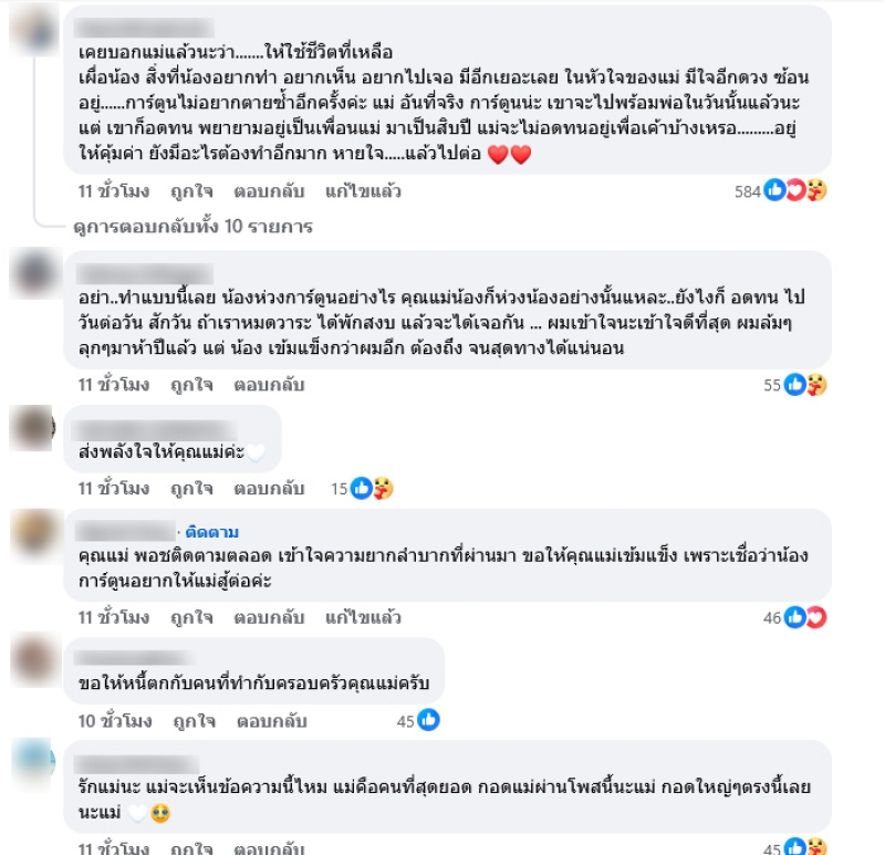 ทั้งนี้ทางด้านแอดมินได้มีการอัปเดตว่า ตอนนี้แอดมินกำลังประสานงานกับญาติและเพื่อนสนิทของคุณแม่ เพื่อช่วยกันตามหาคุณแม่อยู่นะครับ จากที่ทราบล่าสุด คุณแม่มีอาการซึมเศร้าหนัก และยังเครียดกับหนี้ค่าอุปกรณ์การรักษาของน้องการ์ตูนที่ยังค้างอยู่ตั้งแต่น้องป่วย หากมีความคืบหน้า แอดมินจะรีบมาแจ้งให้พี่ๆ ทุกท่านทราบทันทีครับ ขอบคุณทุกกำลังใจที่ส่งมาให้คุณแม่ด้วยนะครับ