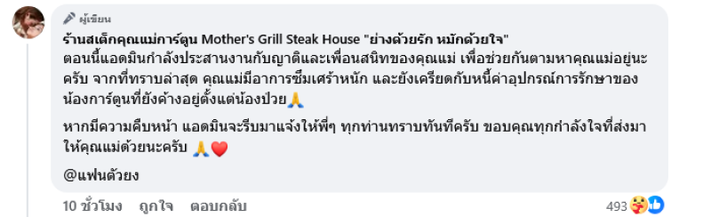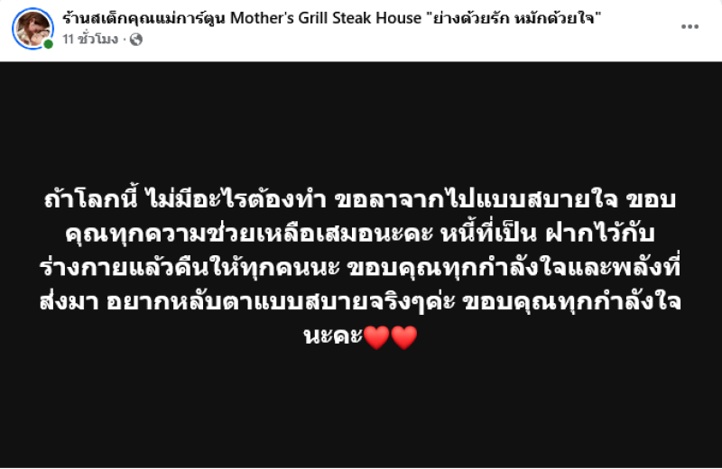 ทำเอาชาวโซเชียลต่างเป็นห่วงเมื่อล่าสุดทางด้านเพจร้านสเต็กคุณแม่การ์ตูน Mother's Grill Steak House "ย่างด้วยรัก หมักด้วยใจ" ซึ่งเป็นเพจเฟซบุ๊กร้านแม่น้องการ์ตูน ได้ออกมาโพสต์ภาพดำเเละบอกลากลางดึกระบุว่า