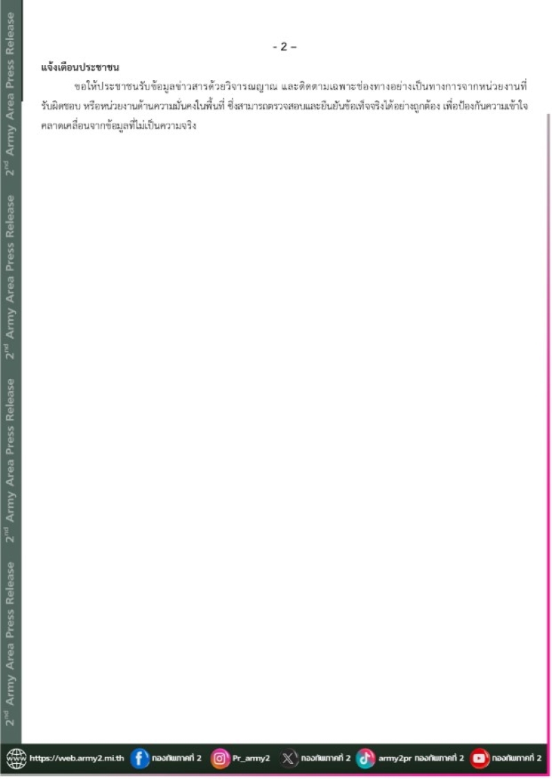 ขอให้ประชาชนรับข้อมูลข่าวสารด้วยวิจารณญาณ และติดตามเฉพาะช่องทางอย่างเป็นทางการจากหน่วยงานที่รับผิดชอบ หรือหน่วยงานด้านความมั่นคงในพื้นที่ ซึ่งสามารถตรวจสอบและยืนยันข้อเท็จจริงได้อย่างถูกต้อง เพื่อป้องกันความเข้าใจคลาดเคลื่อนจากข้อมูลที่ไม่เป็นความจริง