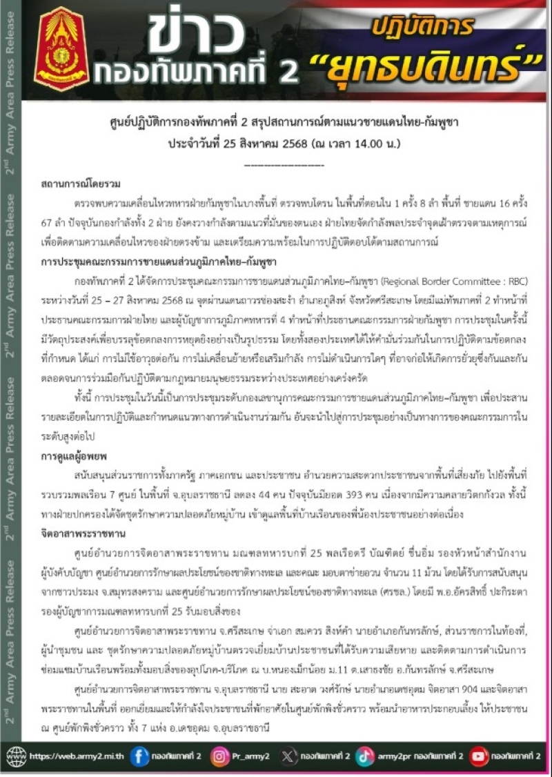 ศูนย์ปฏิบัติการกองทัพภาคที่ 2 ขอแถลงสถานการณ์การตามแนวชายแดนไทย-กัมพูชา ประจำวันที่ 25 สิงหาคม 2568 เวลา 14.00 น. โดยมีรายละเอียด ดังนี้