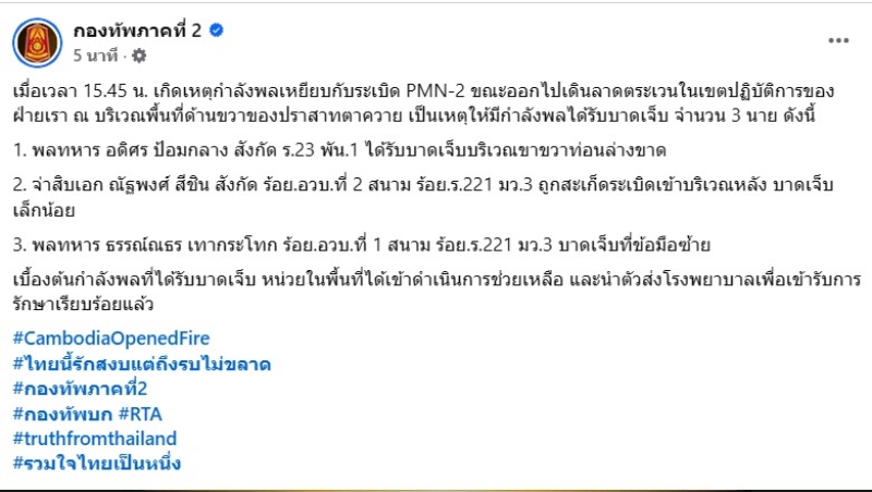 เบื้องต้นกำลังพลที่ได้รับบาดเจ็บ หน่วยในพื้นที่ได้เข้าดำเนินการช่วยเหลือ และนำตัวส่งโรงพยาบาลเพื่อเข้ารับการรักษาเรียบร้อยแล้ว