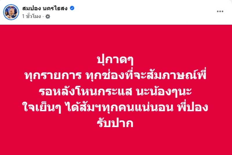 อีกโพสต์ ปุกาดๆ ทุกรายการ ทุกช่องที่จะสัมภาษณ์พี่ รอหลังโหนกระแส นะน้องๆนะ ใจเย็นๆ ได้สัมฯทุกคนแน่นอน พี่ปองรับปาก