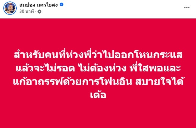 และอีกโพสต์ สำหรับคนที่ห่วงพี่ว่าไปออกโหนกระแสแล้วจะไม่รอด ไม่ต้องห่วง พี่ใสพอและแก้อาถรรพ์ด้วยการโฟนอิน สบายใจได้เด้อ