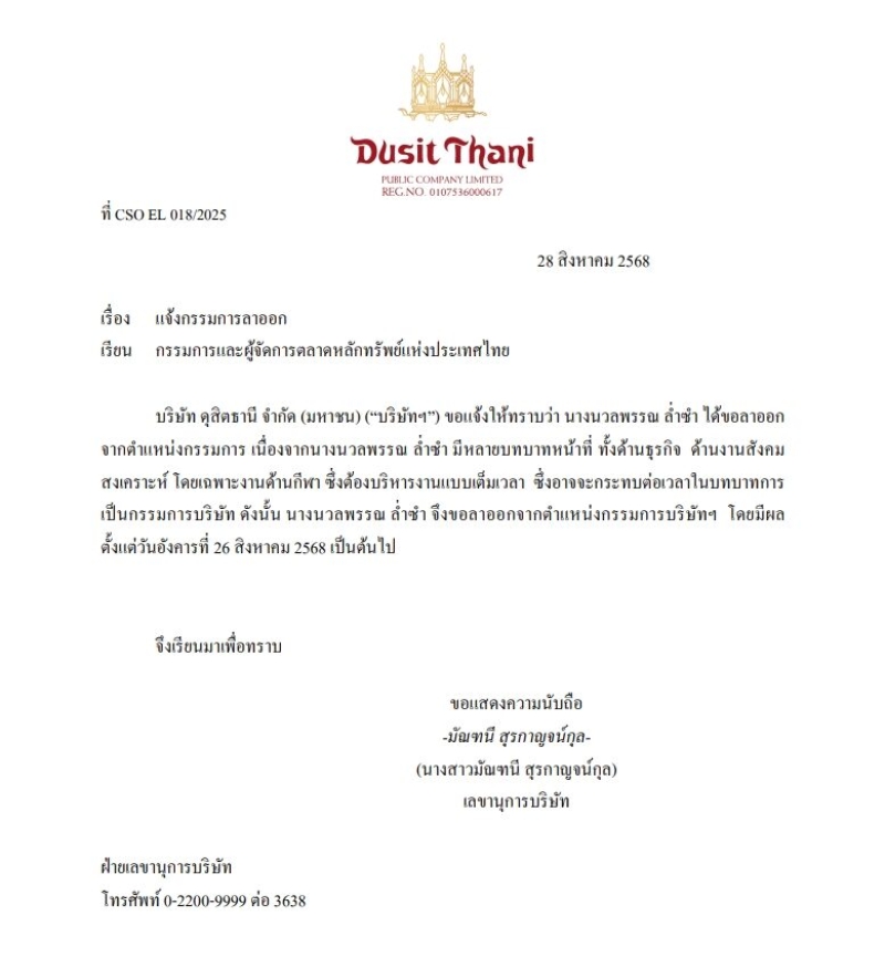 วันที่ 28 สิงหาคม 68 ทาง บริษัท ดุสิตธานี จำกัด ได้ทำหนังสือแจ้งตลาดหลักทรัพย์ ว่า นางนวลพรรณ ล่ำซำ ได้ขอลาออกจากจากตำแหน่งกรรมการ เนื่องจากนางนวลพรรณ ล่ำซำ มีหลายบทบาทหน้าที่ ทั้งด้านธุรกิจ ด้านงานสังคมสงเคราะห์ โดยเฉพาะด้านกีฬา ซึ่งต้องบริหารงานแบบเต็มเวลา