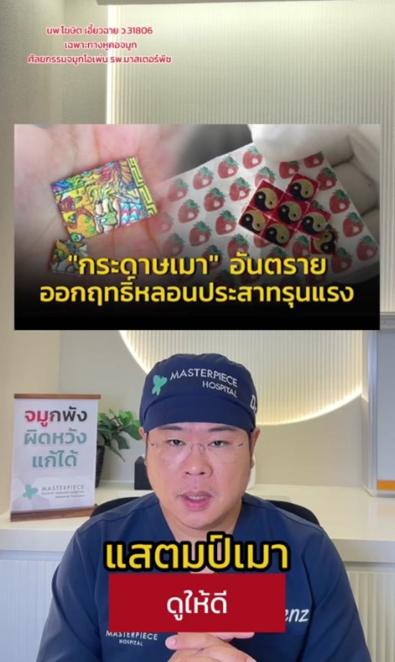 โดย หมอเบนซ์ ระบุว่า แสตมป์เมา หลอนอันตรายตัวใหม่ วัยรุ่นเยาวชนกำลังฮิตมาก แล้วคุณครู ผู้ปกครอง ถ้าไม่รู้จักวิธีดู รับรองจับไม่ติดแน่นอน ซึ่งในแสตมป์นั้นเขาจะเอาสารที่ชื่อว่า Acid หยดลงไปในกระดาษ มันจะแห้งและกักสารอยู่ข้างใน เพราะตัวนี้ปกติจะเป็นกระดาษที่เขาใช้ซับน้ำหมัก หรือน้ำมัน เนื้อมันจะไม่ค่อยแน่น
