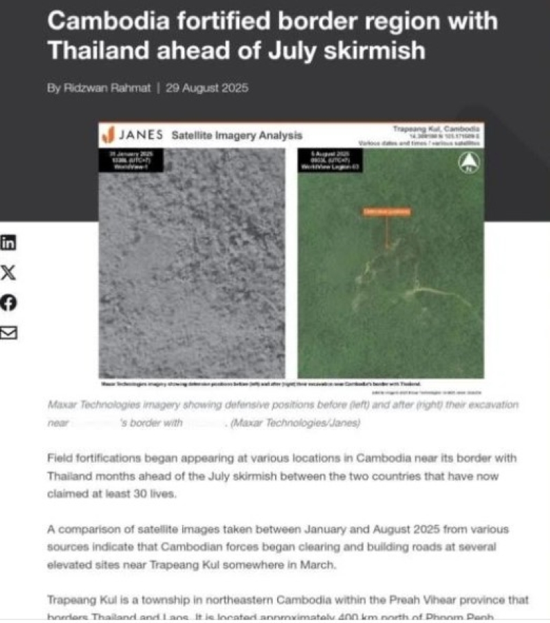 วันนี้ 30 ส.ค. 68 มีการรายงานว่า สำนักข่าว Janes สื่อด้านความมั่นคงและการทหารระดับโลกที่ได้รับการยอมรับในระดับสากล ได้เปิดเผยรายงานพิเศษที่ระบุว่า กัมพูชา ได้ดำเนินการก่อสร้างคูและบังเกอร์ล่วงหน้าหลายเดือน ก่อนที่จะเกิดการปะทะกันบริเวณชายแดนไทย-กัมพูชาในเดือนกรกฎาคมที่ผ่านมา