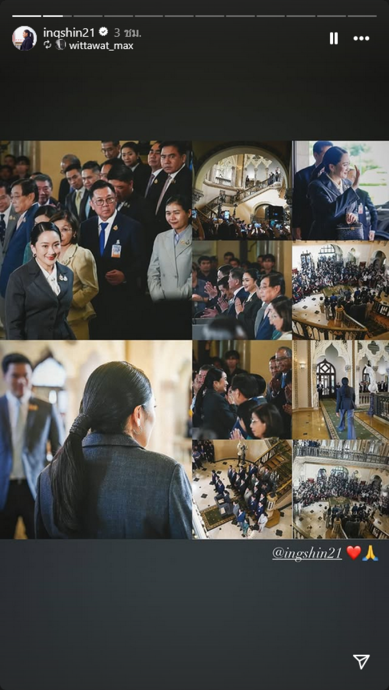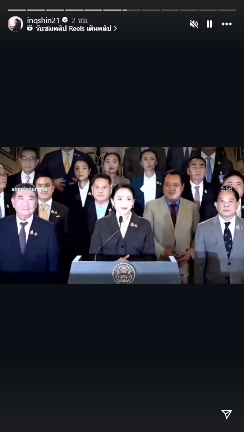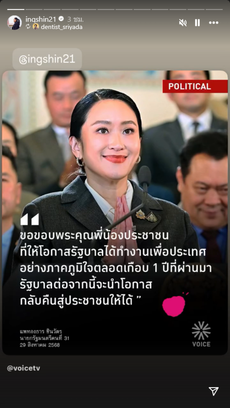 หลังจากศาลรัฐธรรมนูญมีคำวินิจฉัยให้ น.ส.แพทองธาร ชินวัตร พ้นจากตำแหน่งนายกรัฐมนตรี จากกรณีคลิปเสียงการสนทนากับสมเด็จฮุนเซน ล่าสุดเมื่อช่วงเช้าที่ผ่านมา (30 ส.ค. 68) อุ๊งอิ๊ง ได้ออกมาเคลื่อนไหวผ่านอินสตาแกรมส่วนตัว ingshin21 เป็นครั้งแรก ท่ามกลางการจับตามองของคนทั้งประเทศ