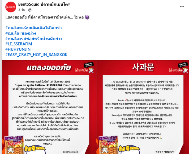 ต่อมาทางด้าน ปลาหมึกเบนโตะ ได้ออกมาโพสต์แถลงการณ์ขอโทษว่า จากเหตุการณ์เมื่อวันที่ 27 สิงหาคม 2568 ที่คุณ ฮอ ยุนจิน ศิลปินวง LE SSERAFIM ได้ลงภาพตนเองร้องไห้โดยมีน้ำตาไหลออกจากตาข้างหนึ่ง ในช่องทางโซเชียลมีเดีย พร้อมแจ้งกับแฟนคลับที่เข้ามาสอบถามว่าเกิดจากความเผ็ดของเบนโตะสีม่วง (รสซอสพริกคั่วหมึกย่าง)