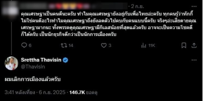 งานนี้ ด้าน นายเศรษฐา ได้ตอบกลับข้อคิดเห็นดังกล่าวสั้นๆ ว่า ผมเลิกการเมืองแล้วครับ