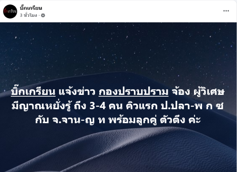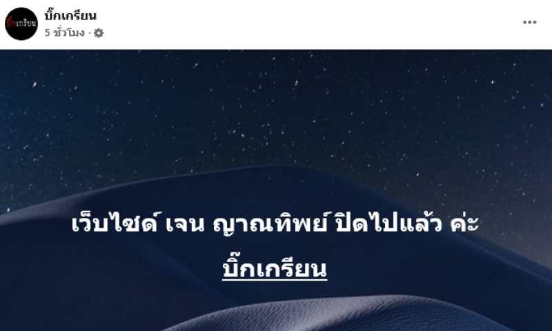 โดยระบุว่า บิ๊กเกรียน แจ้งข่าว กองปราบปรามจ้อง ผู้วิเศษ มีญาณหยั่งรู้ ถึง 3-4 คน คิวแรก ป.ปลา-พ ก ซ กับ จ.จาน-ญ ท พร้อมลูกคู่ ตัวตึง ค่ะ พร้อมอัปเดตว่า เว็บไซด์ของเจน ญาณทิพย์ ได้ทำการปิดตัวลงไปเป็นที่เรียบร้อย