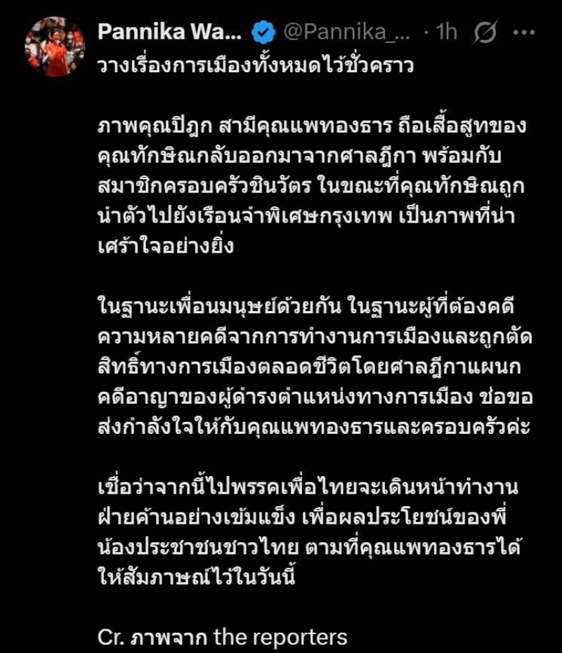 จากเหตุการณ์นายทักษิณ ชินวัตร ถูกควบคุมตัวเข้าเรือนจำพิเศษกรุงเทพมหานคร ล่าสุด นางสาวพรรณิการ์ วานิช ได้ออกมาโพสต์ส่งกำลังใจแพทองธารและครอบครัว ระบุว่า ขอวางเรื่องการเมืองทั้งหมดไว้ชั่วคราว ภาพที่นายปิฎก สุขสวัสดิ์ สามีของนางสาวแพทองธาร ถือเสื้อสูทของนายทักษิณเดินออกมาจากศาลฎีกาว่าเป็นภาพที่น่าเศร้าใจอย่างยิ่ง