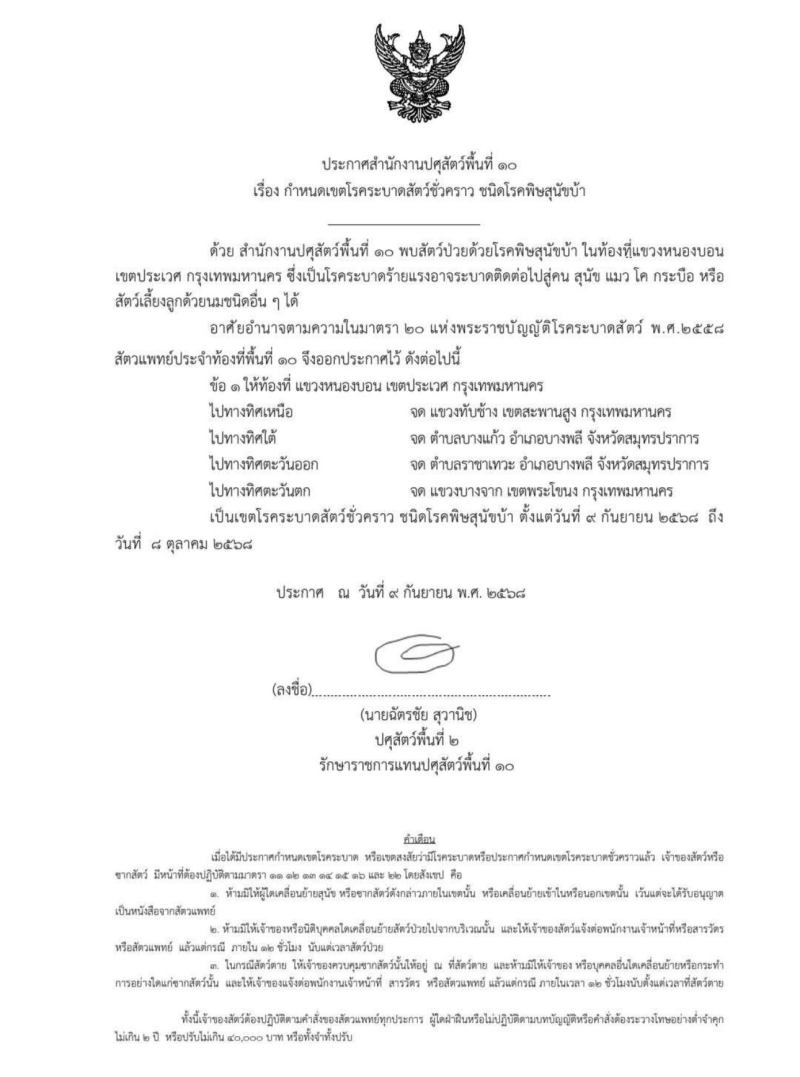 โรคพิษสุนัขบ้า ถือเป็นโรคระบาดร้ายแรงที่สามารถติดต่อจากสัตว์สู่คน รวมถึงสุนัข แมว โค กระบือ และสัตว์เลี้ยงลูกด้วยนมอื่น ๆ โดยอาศัยอำนาจตามมาตรา 20 แห่งพระราชบัญญัติโรคระบาดสัตว์ พ.ศ. 2558 สัตวแพทย์ประจำท้องที่จึงได้ประกาศให้พื้นที่ดังกล่าวเป็นเขตโรคระบาดสัตว์ชั่วคราว ตั้งแต่วันที่ 9 กันยายน - 8 ตุลาคม 2568 ครอบคลุมบริเวณโดยรอบในรัศมี 5 กิโลเมตร