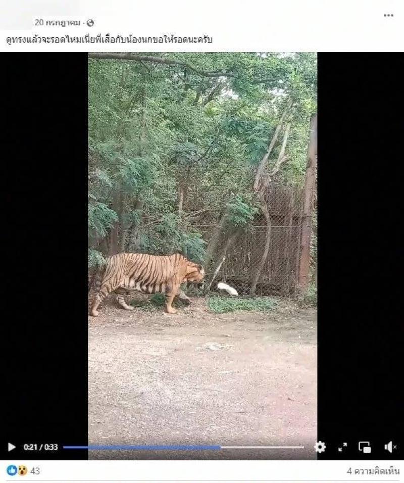 ทั้งนี้เฟซบุ๊คของ นายเจียน พบความเคลื่อนไหวล่าสุดโดยโพสต์คลิปลงเป็นบุ๊กซึ่งเป็นคลิปของเสือโคล่งตัวหนึ่ง กับนกสีขาว ก่อนจะระบุข้อความว่า ดูทรงแล้วจะรอดไหมเนี่ยพี่เสือกับน้องนกขอให้รอดนะครับ