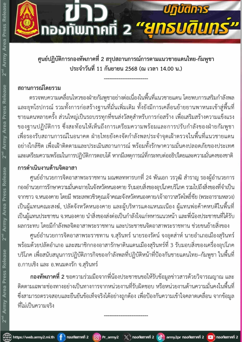 ศูนย์ปฏิบัติการกองทัพภาคที่ 2 สรุปสถานการณ์การตามแนวชายแดนไทย-กัมพูชา ประจำวันที่ 11 กันยายน 2568 (ณ เวลา 14.00 น.)