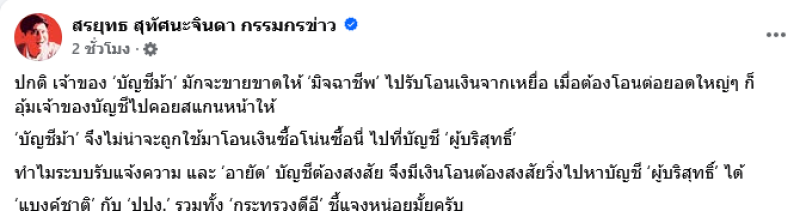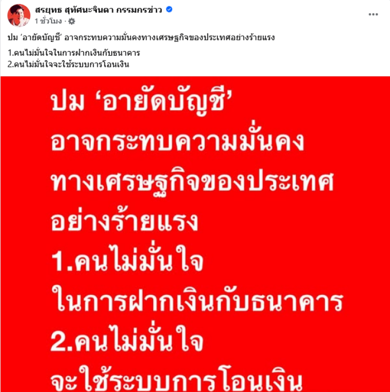 เป็นประเด็นดราม่าร้อนเลยทีเดียวสำหรับการอายัดบัญชี ที่ประชาชนหลายคนต่างได้รับความเดือดร้อน ล่าสุดผู้ประกาศข่าวอย่าง สรยุทธ สุทัศนะจินดา ได้ออกมาโพสต์ตั้งคำถามถึงการทำงานของหน่วยงานที่เกี่ยวข้องว่า
