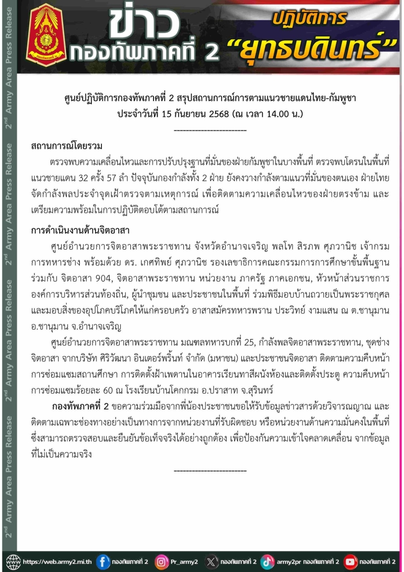 ศูนย์ปฏิบัติการกองทัพภาคที่ 2 สรุปสถานการณ์การตามแนวชายแดนไทย-กัมพูชา ประจำวันที่ 15 กันยายน 2568 (ณ เวลา 14.00 น.) สถานการณ์โดยรวม ตรวจพบความเคลื่อนไหวและการปรับปรุงฐานที่มั่นของฝ่ายกัมพูชาในบางพื้นที่ ตรวจพบโดรนในพื้นที่แนวชายแดน 32 ครั้ง 57 ลำ ปัจจุบันกองกำลังทั้ง 2 ฝ่าย ยังคงวางกำลังตามแนวที่มั่นของตนเอง
