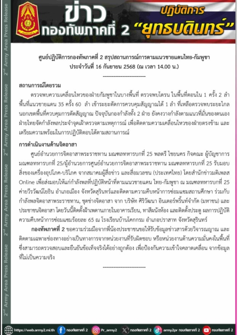 ศูนย์ปฏิบัติการกองทัพภาคที่ 2 สรุปสถานการณ์การตามแนวชายแดนไทย-กัมพูชา ประจำวันที่ 16 กันยายน 2568 (ณ เวลา 14.00 น.)