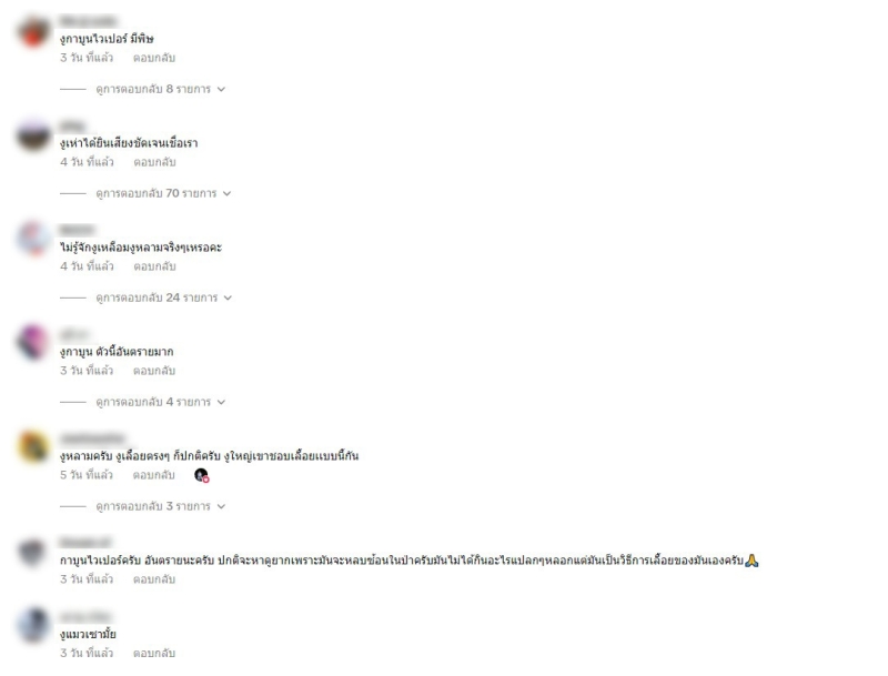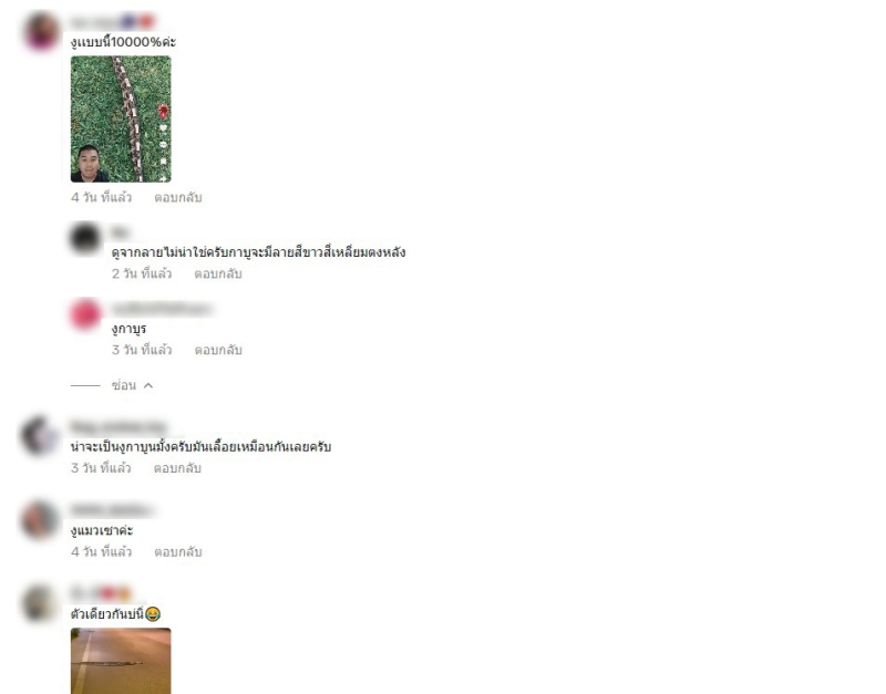 ด้านชาวเน็ตเอง ก็เข้ามาคอมมเนต์กันเพียบ เช่น งูกาบูนไวเปอร์ มีพิษ,งูหลามครับ งูเลื้อยตรงๆ ก็ปกติครับ งูใหญ่เขาชอบเลื้อยเเบบนี้กัน,กาบูนไวเปอร์ครับ อันตรายนะครับ ปกติจะหาดูยากเพราะมันจะหลบซ้อนในป่าครับมันไม่ได้กินอะไรแปลกๆหลอกแต่มันเป็นวิธีการเลื้อยของมันเองครับ,น่าจะเป็นงูกาบูนมั้งครับมันเลื้อยเหมือนกันเลยครับ,งูแมวเซา เป็นต้น