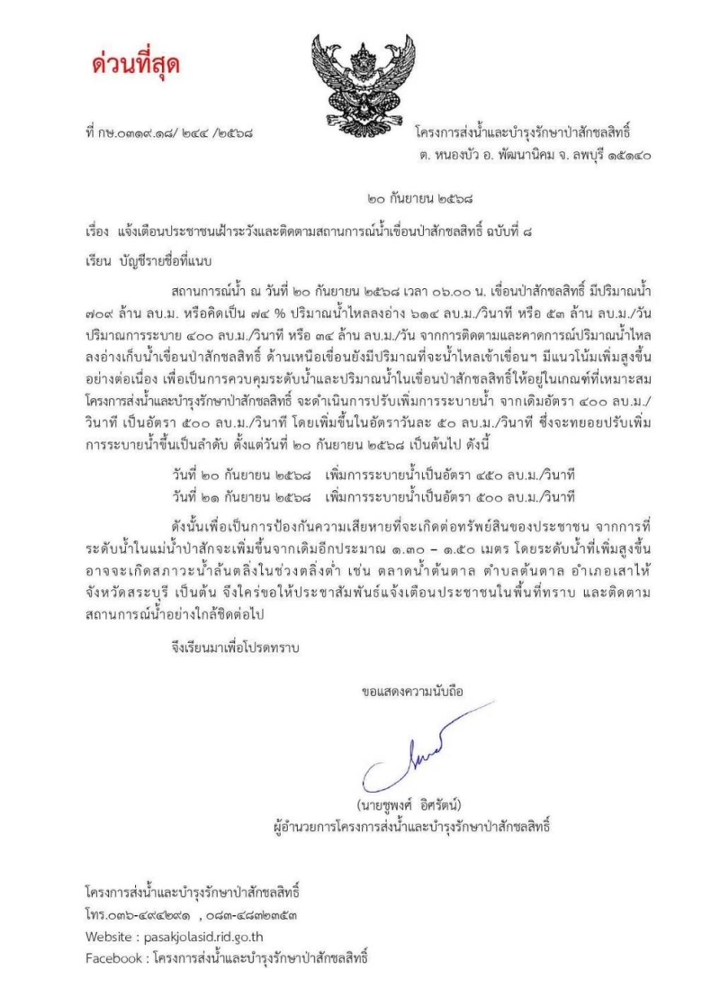 เพื่อควบคุมระดับน้ำให้อยู่ในเกณฑ์เหมาะสม โครงการส่งน้ำและบำรุงรักษาป่าสักชลสิทธิ์จะทยอยปรับเพิ่มการระบายน้ำจาก 500 → 650 ลบ.ม./วินาที
