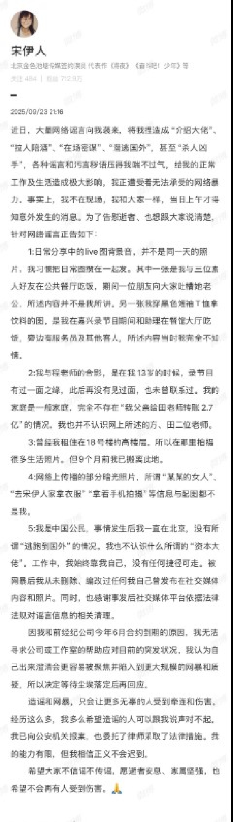 ฉันเป็นพลเมืองจีน หลังจากเกิดเรื่องขึ้น ฉันก็อยู่ที่ปักกิ่งตลอด ไม่เคยหนีออกนอกประเทศอย่างที่ลือ และฉันก็ไม่รู้จักบรรดานายทุนใหญ่ตามที่คนกล่าวหา การทำงานของฉันอาศัยความพยายามของตัวเองมาตลอด ไม่มีทางลัด หลังถูกโจมตีทางออนไลน์ ฉันไม่เคยลบหรือแก้ไขโพสต์หรือรูปใด ๆ ที่เคยลงไว้ และฉันขอบคุณแพลตฟอร์มโซเชียลที่ได้ลบข้อมูลเท็จตามกฎหมายหลังเกิดเหตุ