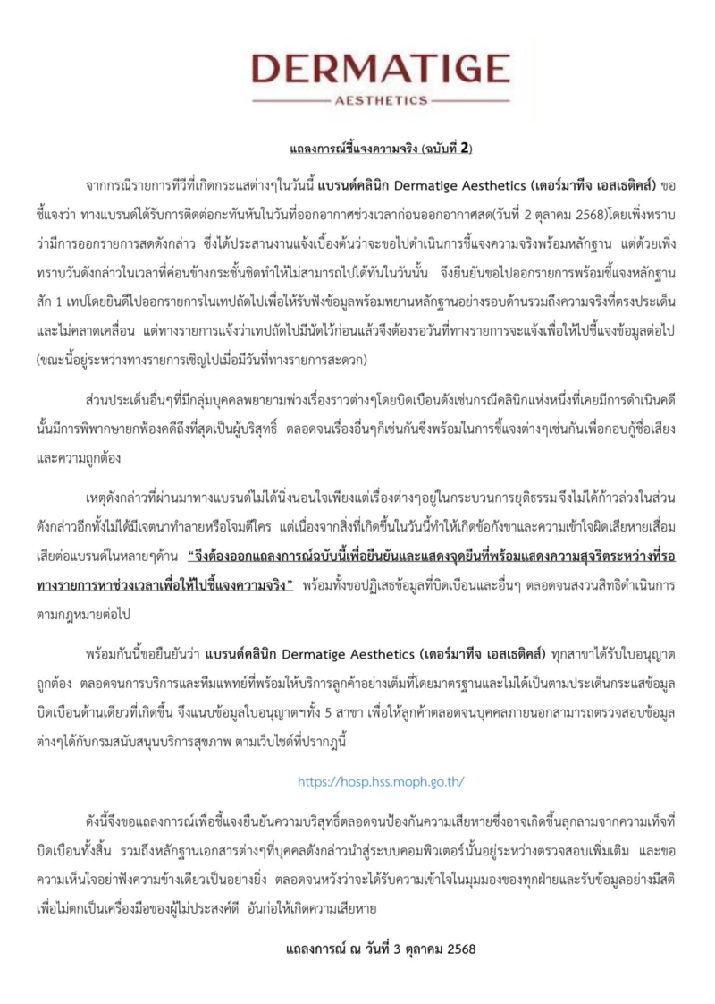 แถลงการณ์ชี้แจงความจริง (ฉบับที่ 2) จากกรณีรายการทีวีที่เกิดกระแสต่างๆในวันนี้ แบรนด์คลินิก Dermatige Aesthetics (เดอร์มาทีจ เอสเธติคส์) ขอชี้แจงว่า ทางแบรนด์ได้รับการติดต่อกะทันหันในวันที่ออกอากาศช่วงเวลาก่อนออกอากาศสด(วันที่ 2 ตุลาคม 2568)โดยเพิ่งทราบว่ามีการออกรายการสดดังกล่าว ซึ่งได้ประสานงานแจ้งเบื้องต้นว่าจะขอไปดำเนินการชี้แจงความจริงพร้อมหลักฐาน