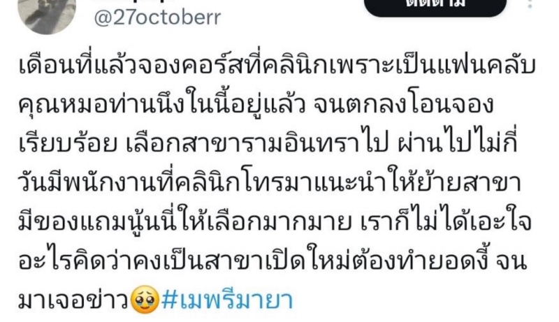 เดือนที่แล้วจองคอร์สที่คลินิกเพราะเป็นแฟนคลับคุณหมอท่านนึงในนี้อยู่แล้ว จนตกลงโอนจองเรียบร้อย เลือกสาขารามอินทราไป ผ่านไปไม่กี่วันมีพนักงานที่คลินิกโทรมาแนะนำให้ย้ายสาขา มีของแถมนู้นนี่ให้เลือกมากมาย เราก็ไม่ได้เอะใจอะไรคิดว่าคงเป็นสาขาเปิดใหม่ต้องทำยอดงี้ จนมาเจอข่าว #เมพรีมายา