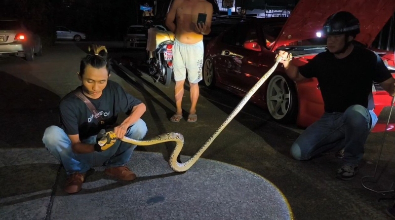 เมื่อวันที่ 5 ต.ค. 68 ที่ผ่านมา นายโกวิท บุญมิ่ง เจ้าหน้าที่กู้ภัยศูนย์วิทยุชาลี รับแจ้งเหตุเจองูเหลือม ยาวประมาณ 1.50 เมตร นอนขดตัวในฝากระโปรงรถเก๋ง ยี่ห้อฮอนด้า พรีลูด สีแดง หมายเลขทะเบียน 4 อ 4494 กทม. บริเวณหลังตลาดสหกรณ์ 3 ต.บางพูด อ.ปากเกร็ด จ.นนทบุรี จึงพร้อมด้วยทีมงาน 3 คน นำอุปกรณ์จับสัตว์เลื้อยคลาน ใช้เวลาจับประมาณ 30 นาที จึงสามารถนำงูออกมาได้