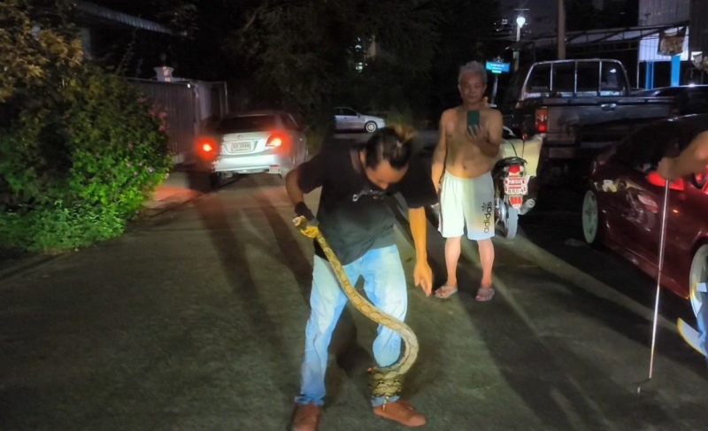 นายโกวิท บุญมิ่ง เจ้าหน้าที่กู้ภัยศูนย์วิทยุชาลี กล่าวว่า ตนได้รับแจ้งเหตุมีงูเหลือมขนาดใหญ่นอนขดตัวอยู่ในห้องเครื่องรถยนต์ บริเวณด้านหลังตลาดสหกรณ์ 3 กำลังฐานวัดกู้จึงเร่งรัดตรวจสอบ พบงูเหลือมความยาวประมาณ 1 เมตร 50 เซ็นติเมตร หนักประมาณ 2 กิโลครึ่ง อยู่ในห้องเครื่องบริเวณฝาสูบ ใช้เวลาในการจับประมาณ 30 นาที เนื่องจากงูขดตัวอยู่บริเวณฝาสูบซึ่งเป็นพื้นที่ที่แคบมาก หลังจากจับได้นำส่งมอบให้สถานีดับเพลิงบางพูด ซอยเลี่ยงเมืองปากเกร็ด เพื่อดำเนินการปล่อยคืนสู่ธรรมชาติ