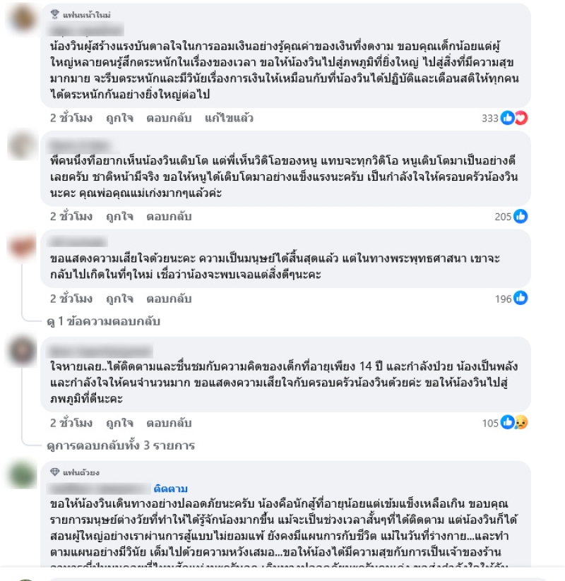 ล่าสุดทางด้านเพจเฟซบุ๊ค Win Phassawin ซึ่งเป็นเพจของ น้องวิน ภาสวิน ตันตินิติ นักวางแผนการเงินรุ่นใหม่ อายุ 14 ปี ป่วยเป็นโรคมะเร็งตั้งแต่อายุ 3 ขวบ และมีโรคแทรกซ้อนหลายอย่าง ปัจจุบันเขาหายจากมะเร็งแล้ว แต่ยังมีโรคหัวใจ และต้องไปโรงพยาบาลเป็นประจำ โดยได้แจ้งข่าวเศร้าว่า น้องวินเสียชีวิตแล้ว