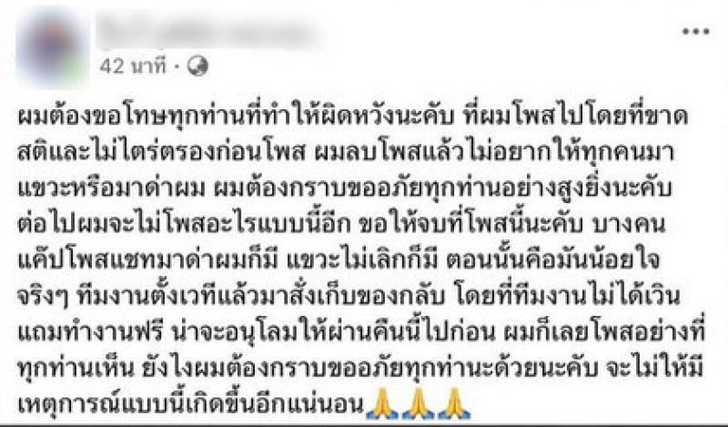 ผมต้องกราบขออภัยอย่างสูงยิ่งนะคับต่อไปผมจะไม่โพสอะไรแบบนี้อีก ขอให้จบที่โพสนี้นะคับ บางคนแค๊ปโพสแชทมาด่าผมก็มี แขวะไม่เลิก ตอนนั้นคือมันน้อยใจจริงๆ ทีมงานตั้งเวทีเเล้วมาสั่งเก็บของกลับ โดยที่ทีมงานไม่ได้เงินเเถมทำงานฟรี น่าจะอนุโลมให้ผ่านคืนนี้ไปก่อน ผมก็เลยโพสอย่างที่ทุกท่านเห็น ยังไงผมต้องกราบขออภัยทุกท่านด้วนะคับ จะไม่ให้เกิดเหตุการณ์แบบนี้เกิดขึ้นอีกแน่นอน