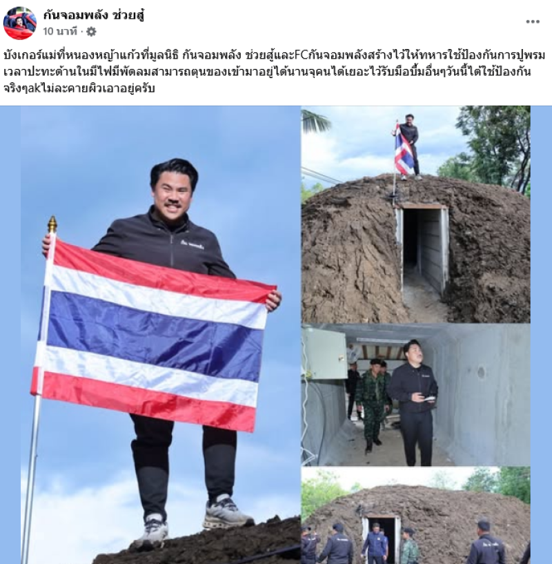บังเกอร์แม่ที่หนองหญ้าแก้วที่มูลนิธิ กันจอมพลัง ช่วยสู้และFCกันจอมพลังสร้างไว้ให้ทหารใช้ป้องกันการปูพรมเวลาปะทะด้านในมีไฟมีพัดลมสามารถตุนของเข้ามาอยู่ได้นานจุคนได้เยอะไว้รับมือบึ้มอื่นๆวันนี้ได้ใช้ป้องกันจริงๆakไม่ละคายผิวเอาอยู่ครับ
