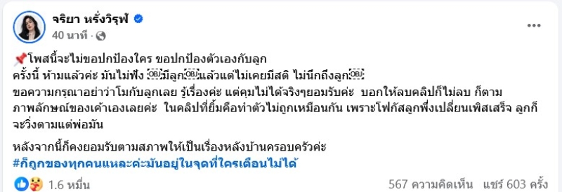 ล่าสุด ภรรยาของแจ็กแปปโฮ อย่าง จริยา หรั่งวิรุฬ ได้ออกมาโพสต์ชี้แจงแล้วว่า โพสนี้จะไม่ขอปกป้องใคร ขอปกป้องตัวเองกับลูก