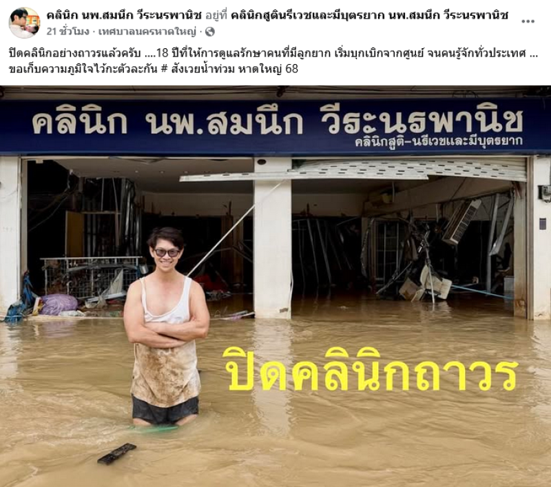 โดยเพจ คลินิก นพ.สมนึก วีระนรพานิช ระบุว่า ปิดคลินิกอย่างถาวรแล้วครับ 18 ปีที่ให้การดูแลรักษาคนที่มีลูกยาก เริ่มบุกเบิกจากศูนย์ จนคนรู้จักทั่วประเทศ ขอเก็บความภูมิใจไว้กับตัวละกัน #สังเวยน้ำท่วมหาดใหญ่ 68 โดยมีชาวเน็ตต่างเข้ามาคอมเมนต์กันอย่างมาก
