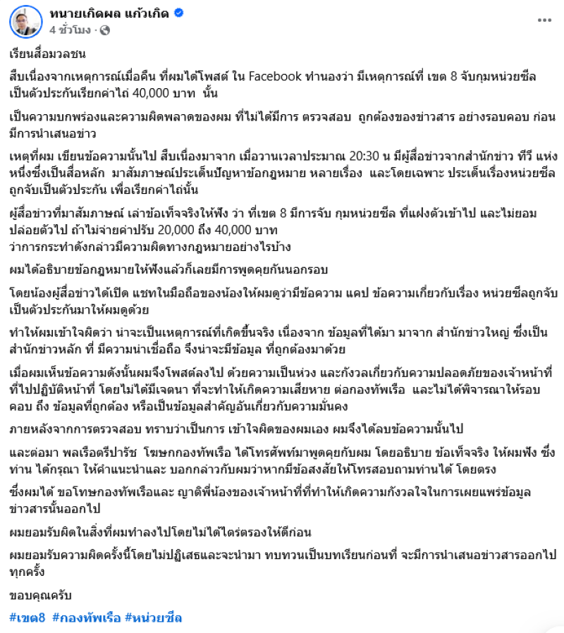 เรียนสื่อมวลชน สืบเนื่องจากเหตุการณ์เมื่อคืน ที่ผมได้โพสต์ ใน Facebook ทำนองว่า มีเหตุการณ์ที่ เขต 8 จับกุมหน่วยซีล เป็นตัวประกันเรียกค่าไถ่ 40,000 บาท นั้น เป็นความบกพร่องและความผิดพลาดของผม ที่ไม่ได้มีการตรวจสอบถูกต้องของข่าวสารอย่างรอบคอบ ก่อนมีการนำเสนอข่าว เหตุที่ผมเขียนข้อความนั้นไป สืบเนื่องมาจาก เมื่อวานเวลาประมาณ 20:30 น มีผู้สื่อข่าวจากสำนักข่าวทีวีแห่งหนึ่ง ซึ่งเป็นสื่อหลัก มาสัมภาษณ์ประเด็นปัญหาข้อกฎหมายหลายเรื่อง และโดยเฉพาะประเด็นเรื่องหน่วยซีลถูกจับเป็นตัวประกัน เพื่อเรียกค่าไถ่นั้น