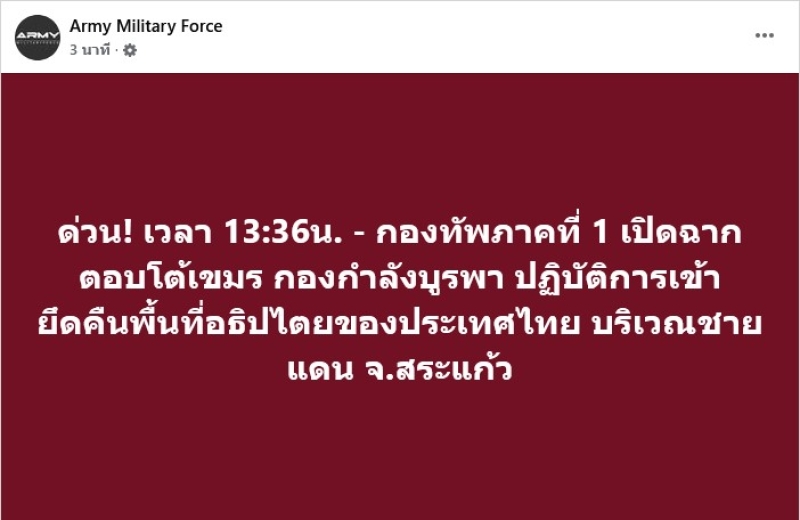 วันที่ 8 ธ.ค. 68 ทางเพจ Army Military Force ด่วน! เวลา 13:36น. - กองทัพภาคที่ 1 เปิดฉากตอบโต้เขมร กองกำลังบูรพา ปฏิบัติการเข้ายึดคืนพื้นที่อธิปไตยของประเทศไทย บริเวณชายแดน จ.สระแก้ว