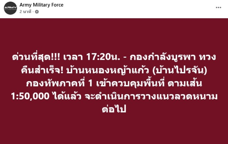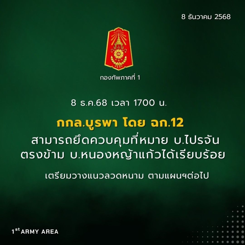 ทาง กองทัพภาคที่ 1 ก็ได้ออกมาโพวต์แล้วว่า English Version Below ศูนย์ปฏิบัติการกองทัพภาคที่ 1 ขอรายงานความคืบหน้า เมื่อเวลา17.00 น. กกล.บูรพา โดย ฉก.12 สามารถยึดควบคุมที่หมาย บ.ไปรจัน ตรงข้ามบ้านหนองหญ้าแก้วได้เรียบร้อย และเตรียมวางแนวลวดหนาม ตามแผนฯต่อไป 8 ธันวาคม 2568