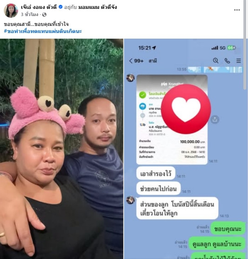ล่าสุต ทำเอาชาวเน็ตคอมเมนต์สนั่น เมื่อทาง facebook เจ๊เอ๋ งอแง ตัวดี ได้โพสต์พร้อมสามีและแชทที่คุยกัน โดยเผยแคปชั่นว่า ขอบคุณสามี…ขอบคุณที่เข้าใจ #ขอทำเพื่อทดแทนแผ่นดินเกิดนะ ซึ่งทางสามีเจ๊เอ๋ ได้โอนเงินไป1แสนบาท เพื่อเอาไปช่วยชาวบ้านที่อพยพจากการปะทะชาวแดนไทยกัมพูชา