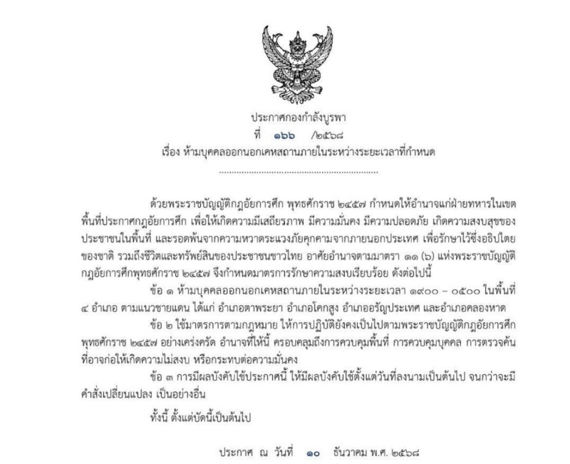 ตาพระยา โคกสูง อรัญประเทศ และคลองหาด ตั้งแต่เวลา 19.00-05:00 เพื่อความปลอดภัยของประชาชนในพื้นที่หลังมีการสู้รบ มีผลตั้งแต่วันนี้ 10 ธ.ค.68