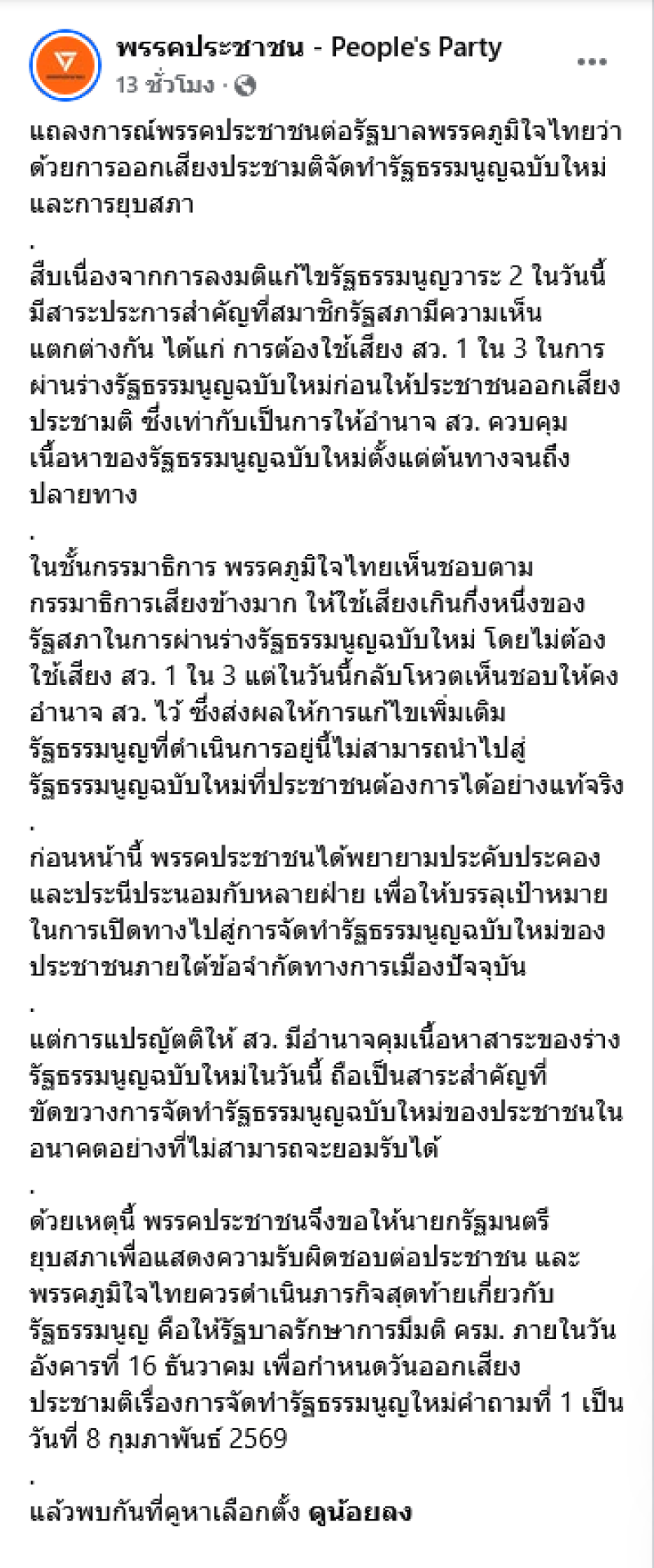 จากกรณีที่ นายกอนุทิน ชาญวีรกูล ได้ประกาศยุบสภา ทั้งนี้พรรคประชาชนได้แถลงการณ์ว่า แถลงการณ์พรรคประชาชนต่อรัฐบาลพรรคภูมิใจไทยว่าด้วยการออกเสียงประชามติจัดทำรัฐธรรมนูญฉบับใหม่และการยุบสภาสืบเนื่องจากการลงมติแก้ไขรัฐธรรมนูญวาระ 2 ในวันนี้ มีสาระประการสำคัญที่สมาชิกรัฐสภามีความเห็นแตกต่างกัน