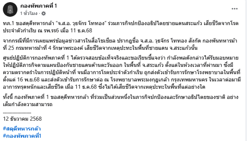 ศูนย์ปฏิบัติการกองทัพภาคที่ 1 ได้ตรวจสอบข้อเท็จจริงและขอเรียนชี้แจงว่า กำลังพลดังกล่าวได้รับมอบหมายให้ปฏิบัติภารกิจตามแผนป้องกันชายแดนด้านตะวันออก ในพื้นที่ จ.สระแก้ว ตั้งแต่ในห้วงเวลาที่ผ่านมา ซึ่งมีความตรากตรำในการปฏิบัติหน้าที่ จนมีอาการโรคประจำตัวกำเริบ ถูกส่งตัวเข้ารับการรักษาโรงพยาบาลในพื้นที่ ตั้งแต่ 16 พ.ย.68 และส่งตัวเข้ารับการรักษาต่อ ณ โรงพยาบาลพระมงกุฎเกล้า กรุงเทพมหานคร ในเวลาต่อมามีอาการทรุดหนักและเสียชีวิต เมื่อ 11 ธ.ค.68 ซึ่งไม่ได้เสียชีวิตจากเหตุปะทะในพื้นที่แต่อย่างใด