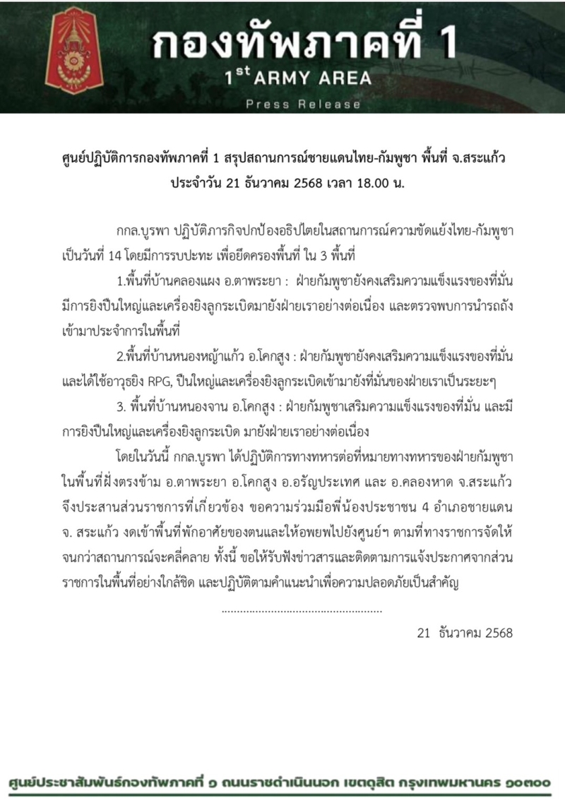 ศูนย์ปฏิบัติการกองทัพภาคที่ 1 สรุปสถานการณ์ชายแดนไทย-กัมพูชา พื้นที่ จ.สระแก้ว ประจำวัน 21 ธันวาคม 2568 เวลา 18.00 น.